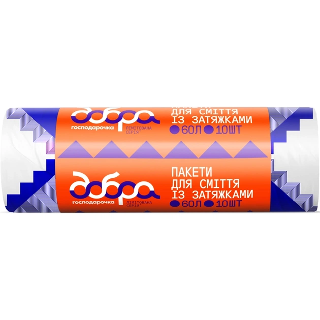 Працюючи над цією колекцією, ми звернулися до української вибійки – давнього мистецтва оздоблення тканин, ця техніка прийшла до нас ще з XVII століття й була популярною серед українських майстрів та майстринь, які за допомогою різьблених дерев'яних дощечок наносили орнаменти на текстиль. Зручні пакети для сміття з затяжками Добра господарочка з колекції Українська вибійка відразу привертають уваги своїм унікальним дизайном з витонченими орнаментами, який робить їх справжньою окрасою кухні. Вони міцні та зручні – витримують навантаження, не рвуться, а завдяки затяжці їх легко зав’язувати та переносити. Пакети виготовляються з якісного поліетилену високої густини із використанням 70 % вторинної сировини. В рулоні 10 пакетів об’ємом 60 л.