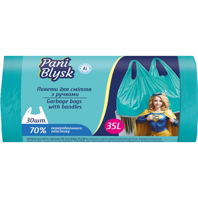 Пакети для сміття з ручками Pani Blysk для господарських цілей (пакування, зберігання, транспортування нехарчових продуктів, сміття). Для стандартного відра. Зручні, міцні, надійні. Виготовлені з повторно переробленного пластика.
