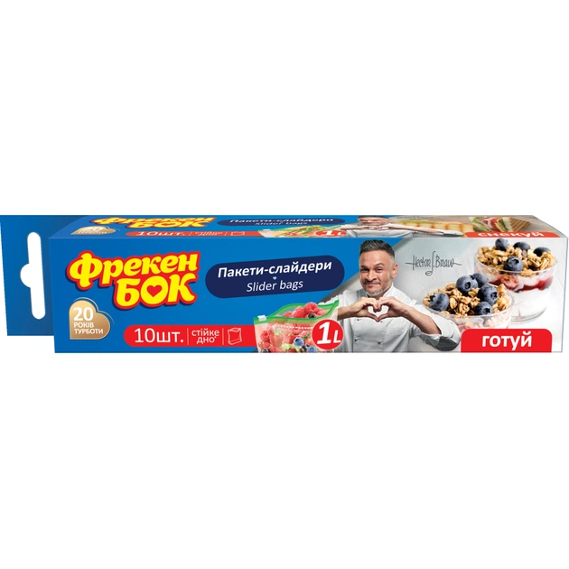Універсальні пакети-слайдери торгової марки Фрекен БОК, призначені для зберігання, заморожування й пакування харчових і нехарчових продуктів. Замок-слайдер надійно та герметично закриває пакет і не допускає витікання рідин, а також спрощує процес відкривання.