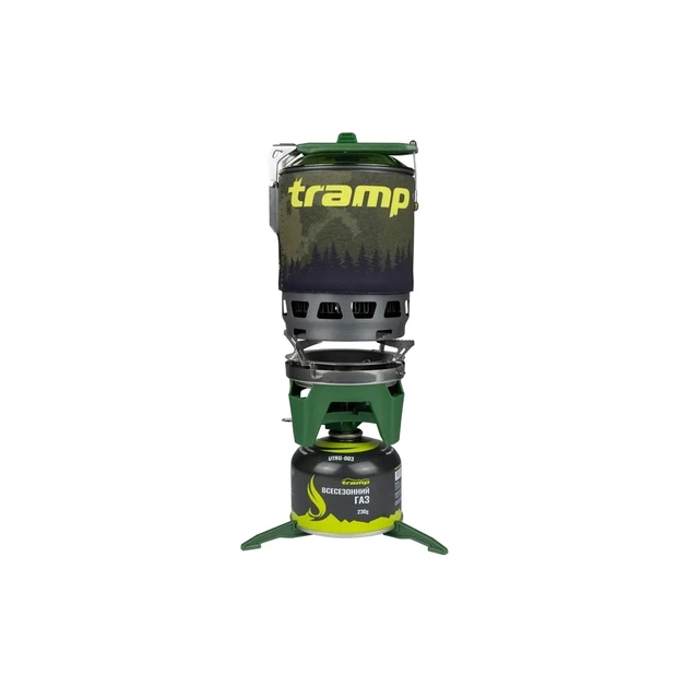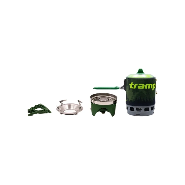 Система для приготування їжі Tramp UTRG-049 - інтегрована система приготування їжі складається з казанка на 800 мл в неопреновому чохлі з вбудованим у вітрозахисний екраном (радіатором - теплообмінником), який підключається до газового пальника, а також підставки під газові балони та підставки для використання іншого посуду в режимі звичайного пальника.