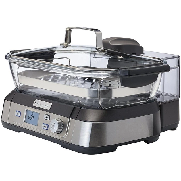 Резервуар для води. Чаша для заливання води пароварки Cuisinart STM1000E вміщує в себе 1,4 л. Такий обсяг води дозволяє готувати їжу на швидких і повільних програмах, використовуючи різноманітні температурні режими. Парова чаша має кришку, обидві деталі конструкції зроблені з боросилікатного скла - міцного термостійкого матеріалу.