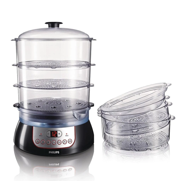 У чаші для варіння XL можна приготувати улюблений суп, тушковане блюдо, вівсяну кашу, рис та інші страви. Натисніть кнопку попередньої установки часу і - вперед! Більш насичені аромати Flavour Booster насичує страви смачними ароматами трав і спецій. Характеристики : потужність 900 Вт ; кількість ярусів 3 шт ; об'єм чаші 8,6 л (загальний , 2,5 / 2,6 / 3,5 л) ; піддон для збору крапель + чаша для приготування рису + LCD дисплей. Додаткові функції: таймер, долив води під час приготування; безпеку захисту від перегріву ; індикатор рівня води ; індикатор утворення вапна.