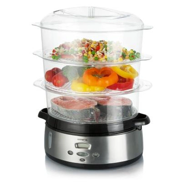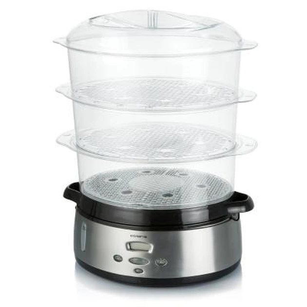Пароварка недорога, але містка і функціональна. Вона має 3 чаші загальною місткістю 9 літрів. У ній можна приготувати абсолютно все, в комплекті також навіть чаші для рису і круп, тому ви зможете приготувати дуже корисні каші. У чаші є поглиблення для варіння яєць. З зручних функцій має функцію підтримки страви гарячим. Легко миється в посудомийній машині. При покупці цієї моделі ви отримаєте книгу рецептів для даної пароварки в подарунок.