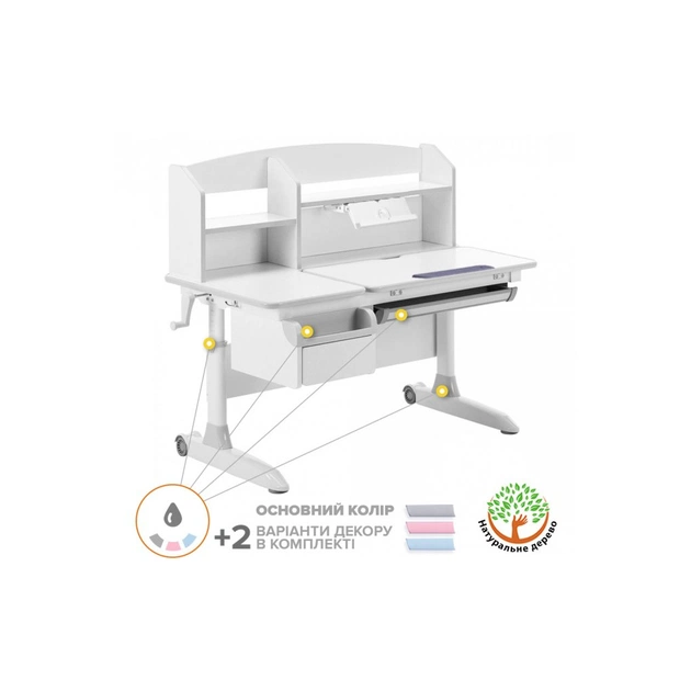 Особливістю дитячої парти Romana є можливість зміни кольорових накладок. Купуючи стіл з ефектом росту у базовій комплектації з сірими накладками, Ви отримаєте як подарунок 2 набори кольорових накладок у рожевому та блакитному кольорі. Змінюйте кольори та створюйте власний дизайн залежно від дизайну кімнати чи настрою.