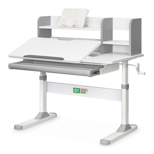 Він виготовлений з міцних безпечних матеріалів і гармонійно впишеться в інтер’єр будь-якої дитячої кімнати. Стіл доповнений надбудовою, яка складається з двох полиць для зручного зберігання шкільного приладдя. Переносна підставка для книги з регульованим кутом нахилу прекрасно підходить для занять школяра. Виготовлена з безпечного пластику, вона може розміщуватися на будь-якій комфортній відстані від очей дитини.