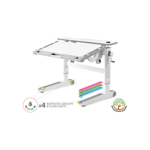 Висота всієї конструкції столу легко регулюється механічною ручкою, на ніжках є спеціальна розмітка зросту, щоб відрегулювати висоту столу відповідно до зросту дитини. Додатково можна регулювати й висоту робочої частини стільниці за допомогою спеціального важеля. Високоякісний механізм газліфт забезпечує плавність і легкість руху. Також робоча поверхня стола обладнана функцією регулювання кута нахилу в діапазоні 0-30 градусів для підтримання правильної постави під час занять (читання, письмо, малювання).