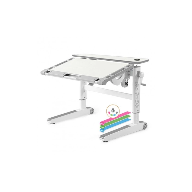 Стіл розроблений із можливістю чергування положення сидячи-стоячи. Під час тривалого навчального/робочого процесу що 30—40 хвилин трансформуйте стіл зі стандартного робочого місця в стильний простір для роботи стоячи. Унаслідок чого буде підтримуватися висока ефективність, уважність і концентрація, а також буде формуватися правильна постава. Висота всієї конструкції столу легко регулюється механічною ручкою, на ніжках є спеціальна розмітка зросту, щоб відрегулювати висоту столу відповідно до зросту дитини. Додатково можна регулювати й висоту робочої частини стільниці за допомогою спеціального важеля. Високоякісний механізм газліфт забезпечує плавність і легкість руху.