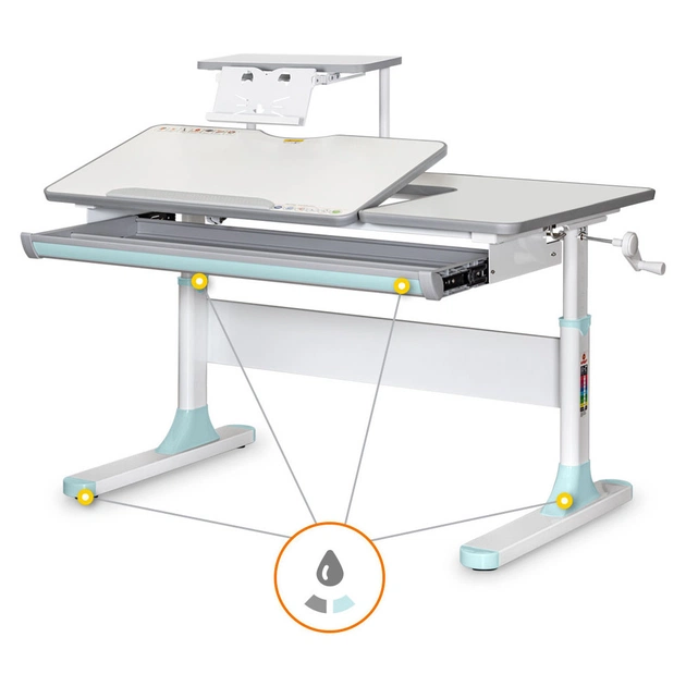 Висота столу регулюється за допомогою черв'ячного механізму ручкою, яку при складанні можна встановити праворуч або ліворуч. За допомогою газліфта рухлива частина стільниці змінює кут нахилу до 60 градусів, що допомагає зберегти правильну поставу під час роботи за столом.