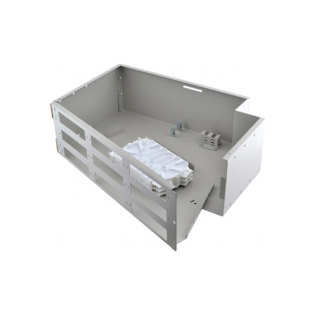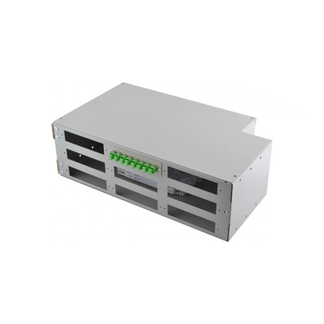 FOB-19/2-336/36-3-72 складається з сталевого корпусу з кришкою і поворотною передньою панеллю. Поворотна панель відкривається справа, забезпечуючи доступ до сплайс-касет без демонтажу з стійки. На передній поверхні є 9 посадочних місць (вікон), в які можна встановити лицьові панельки під адаптери різних типів - до 8 шт. SC, FC або LC duplex.