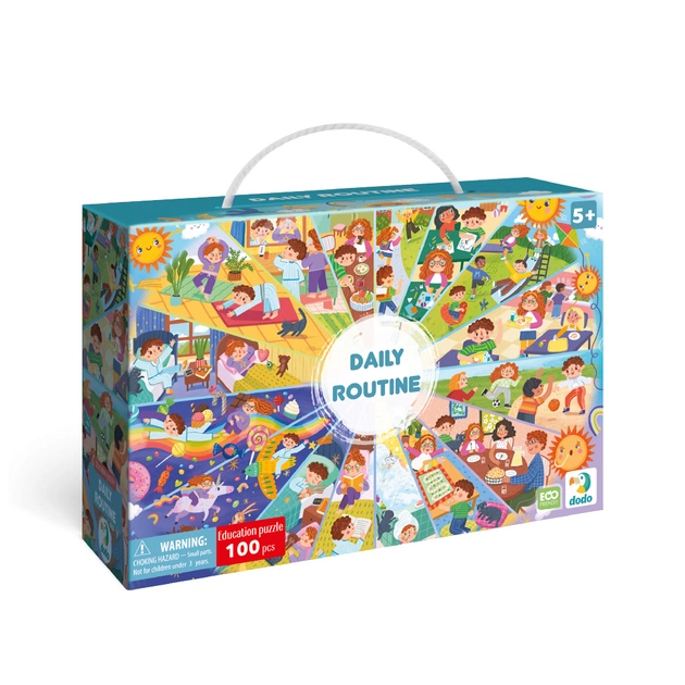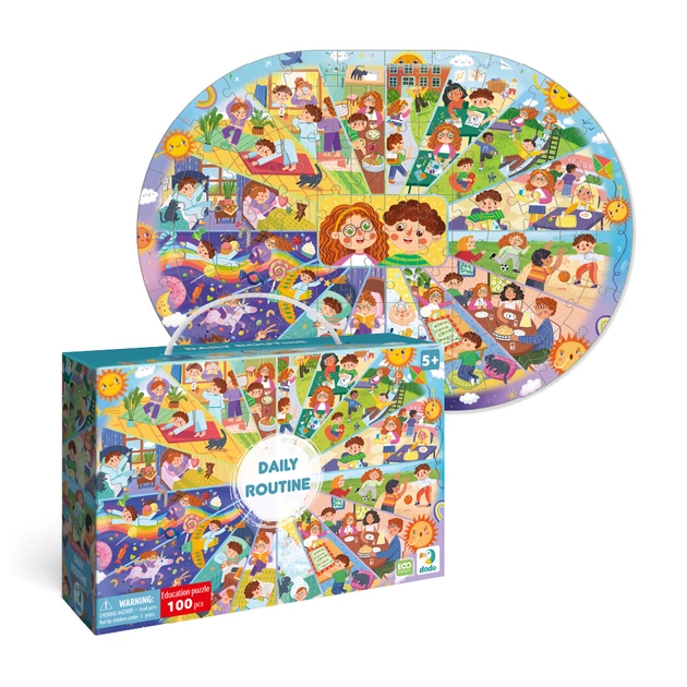 Цей яскравий пазл познайомить дитину із розпорядком дня. На зображенні безліч цікавих деталей, які допоможуть розвинути спостережливість та уважність. 100 деталей пазла зручно з'єднуються між собою, створюючи яскраву картину. Це чудова гра для розвитку логічного мислення, уяви та дрібної моторики.