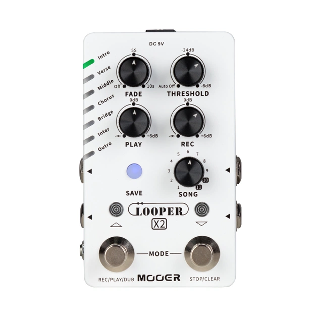 Користувачі також можуть перемикати функцію автоматичного запису, щоб починати запис циклу кожного разу, коли виявляється вхідний гітарний сигнал за допомогою ручки THRESHOLD. Додаткові ручки включають окремі регулятори рівня гучності для запису та відтворення, а також ручку з 11 варіантами для прокручування банків пісень. Подвійний педальний перемикач пропонує знайомі елементи керування лупером, а для користувачів, яким потрібний більший контроль, Looper X2 також підтримує зовнішній футсвіт, який може виконувати різні операції, такі як циклічне перемикання між різними частинами поточного обраного банку пісень.