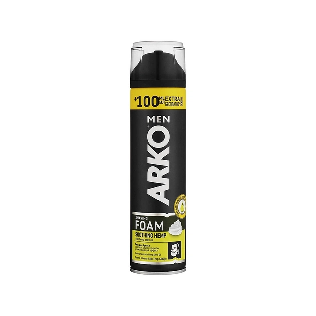 Піна для гоління ARKO з олією насіння конопель із заспокійливим і зволожувальним ефектом забезпечує м'яке гоління завдяки спеціально розробленій формулі.