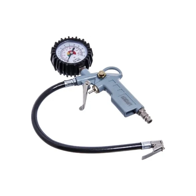 Пістолет для підкачки шин AIRKRAFT STG-05 - необхідна річ для підкачки, контролю та стравлювання внутрішнього тиску в шинах автомобіля. Пістолет STG-05 має вбудований манометр, діаметром 63мм, циферблат якого дозволяє комфортно зчитувати показники тиску до 10 bar. Пістолет підключається до зовнішнього джерела стисненого повітря, і має максимальний витрата повітря 200 літр/хв. Поверхня манометра виготовлена з протиударного пластика, для захисту від механічних пошкоджень. Корпус виконаний зі сталі, високої якості, що забезпечить тривалий термін служби. Ергономічна ручка має компактну форму, яка добре сидить в руці. Також в комплекті йде міцним гумовим шлангом, високого тиску, що цілком достатньо для приєднання до ніпеля в будь-якому положенні колеса. На кінці шланга розташований латунний наконечник зі спеціальним фіксатором, який дозволить щільно зафіксувати його на ніпель. За рахунок швидкоз'ємного з'єднувача, розмір вхідного отвору 1/4"дюйма, можна швидко і легко приєднається до джерела подачі стисненого повітря. Даний пістолет, знайшов широке застосування не тільки автомайстерень, шиномонтажі але і на високоточному виробництві.