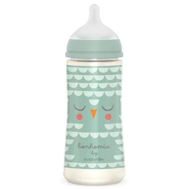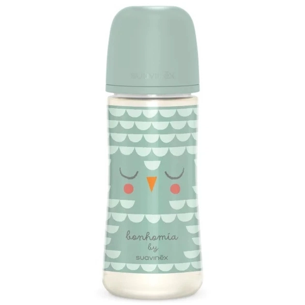 Пляшечки Suavinex Bonhomia виготовлені з прозорого поліаміду найвищої якості. Пляшечка на 270 мл оснащена фізіологічною соскою SX Pro із середнім потоком, яка пропускає всі типи рідин середньої щільності, ідеально підходить для молока, соку та води.