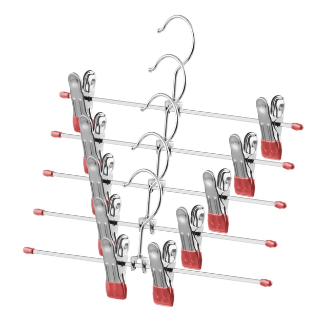 Вішаки є простим, корисним і ефективним помічником для належного зберігання речей. Модель ARDESTO в лаконічному дизайні виготовлено з металу та ПВХ і призначено для розвішування штанів і спідниць. Прищіпки можна регулювати за довжиною. Всередині кожної прищіпки є силіконова подушечка, яка забезпечує надійне та делікатне затискання. Міцний гачок не обертається. Розмір тремпеля червоного кольору становить 30 × 11 см. У наборі 5 вішаків. Із вішаками ARDESTO гардероб буде добре організованим.
