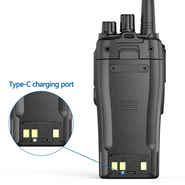 Отдельно хотим обратить внимание на зарядку этой рации. Рация Baofeng 1909 укомплектована стандартным зарядным устройством, это зарядный стакан с блоком питания. Но в этой модели производитель предусмотрел ещё и альтернативный способ зарядки. На задней стенке аккумулятора есть коннектор "type С" с индикатором заряженности для зарядки радиостанции. Это означает что вы сможете заряжать свою рацию не только в "родном" стакане, но и от любых источников питания с USB, прикуривателя, повербанка и тд.
