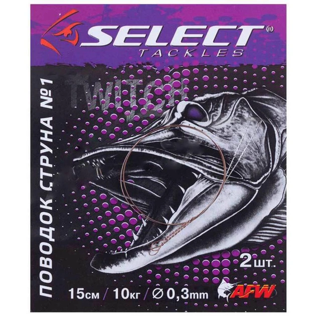 Повідець Select струна виготовляється з унікального матеріалу темного кольору (Stainless Steel Single), розробленого і виробленого AFW (USA). Його пружність, малий діаметр і надлегка вага дозволяють рибалці постійно відчувати контакт з приманкою. Він не схильний до корозії. За рахунок конструкції без застібки і вертлюжка, мінімізує захлест приманки. Рекомендований для лову твічінгом.