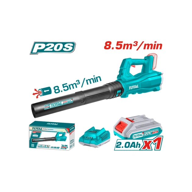 Акумуляторна повітродувка TOTAL TABLI203235 призначена для прибирання садово-паркових територій шляхом здування сміття великою швидкістю повітряного потоку. Повітродувка має високопродуктивний турбовентилятор із приводом від щіткового двигуна, а також збільшений діаметр вихідного сопла для кращої продуктивності. Швидкість без навантаження становить 15000 об/хв, витрата повітря - 8.5 м³/хв, максимальна швидкість повітряного потоку - 115 км/год. До комплекту входить акумуляторна батарея 2 А, зарядний пристрій, коробка.