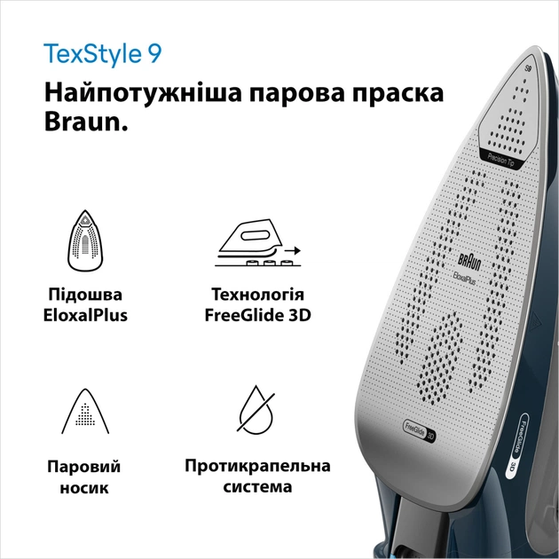 Braun SI 9682 DB – розроблений для максимальної продуктивності. Потужність 3200 Вт у поєднанні з високою подачею пари для досягнення оптимальних результатів. Парова праска TexStyle 9 SI 9682 DB - найпотужніша парова праска від Braun. Завдяки підошві FreeGlide 3D він плавно ковзає, долаючи будь-які перешкоди. Здатність ковзання підтримується підошвою EloxalPlus з покращеним дизайном кромок. Кількість пари можна плавно регулювати. Завдяки налаштуванню iCare підтримується безпечна температура всіх тканин. Для забезпечення тривалої подачі пари, парова праска оснащена унікальною системою збору накипу ActiClean, з автоматичним нагадуванням про необхідність видалення накипу. У режимі Eco пристрій заощаджує до 70% енергії в порівнянні з режимом Turbo.
