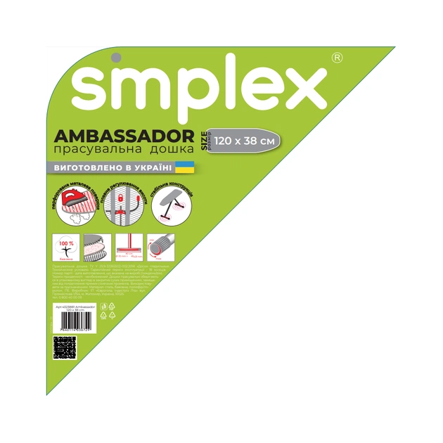 Сьогодні в побуті неможливо обійтися без прасувальної дошки. Виробник ІП «Євроголд Індестріз Лтд» розробив нову лінію прасувальних дощок Smplex. Прасувальна дошка AMBASSADOR має зручну конструкцію. Основа цієї моделі виготовлена з металевої перфорованої сітки, що забезпечує найкраще поширення пари. Конструкція має Т-подібні ніжки, що сприяють стійкості дошки для прасування. Прасувальна дошка комплектується підставкою під праску та тримачем для вішалок.