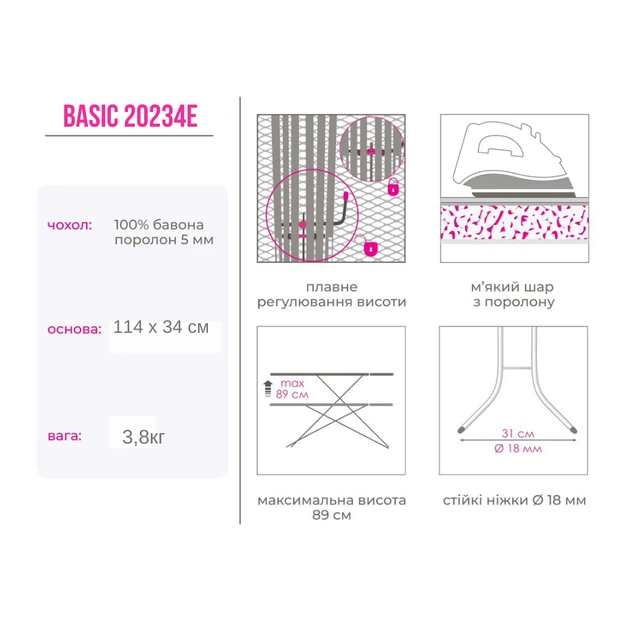 Прасувальна дошка BASIC має зручну конструкцію. Основа даної моделі виготовлена з металевої перфорованоі сітки, що забезпечує краще поширення пари. Має підставку під праску.