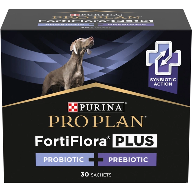 Purina Pro Plan FortiFlora Plus (Плюс) - додатковий корм для дорослих собак і цуценят (після відлучення від матері) з синбіотичною дією пребіотика і пробіотика. Сприяє підтримці здорового мікробіома, його балансу та зміцненню імунного захисту. Кожне саше містить гарантований рівень пробіотичних бактерій (мікрокапсульованих для підвищення стабільності в середовищі та ефективності) у поєднанні з пребіотиком рослинного походження.