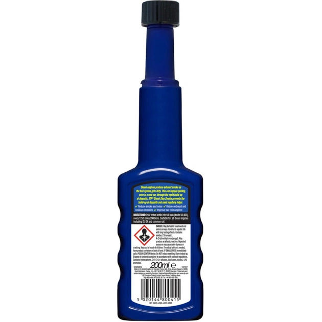 STP Diesel Stop Smoke - Присадка в дизпаливо, розроблена спеціально для зниження кількості диму в вихлопних газах за рахунок очищення паливної системи і інжекторів і підтримки їх в чистоті. Концентроване поєднання миючих і диспергуючих компонентів сприяє підвищенню і збереженню ефективності дизельного мотора і скорочує експлуатаційні витрати. StP Diesel Stop Smoke GST93200EN 200мл універсально підходить для всіх дизельних силових агрегатів, включаючи DI, IDI, Common Rail і обладнані системою очищення вихлопних газів (сажовим фільтром DPF). Має властивість запобігати окислення палива і утворення конденсату.