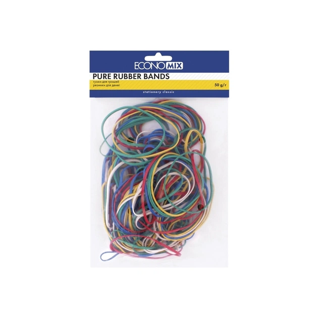 Гумки для грошей ТМ Economix 50г, колір асорті. Гумки для грошей виготовлені з високоякісного каучуку діаметром 48 мм. Застосовуються для перев'язки (пакування) грошових купюр; дрібна фасовка; фасовка зелені / квітів; використовують в офісах; у фармацевтичних компаніях та багато іншого.