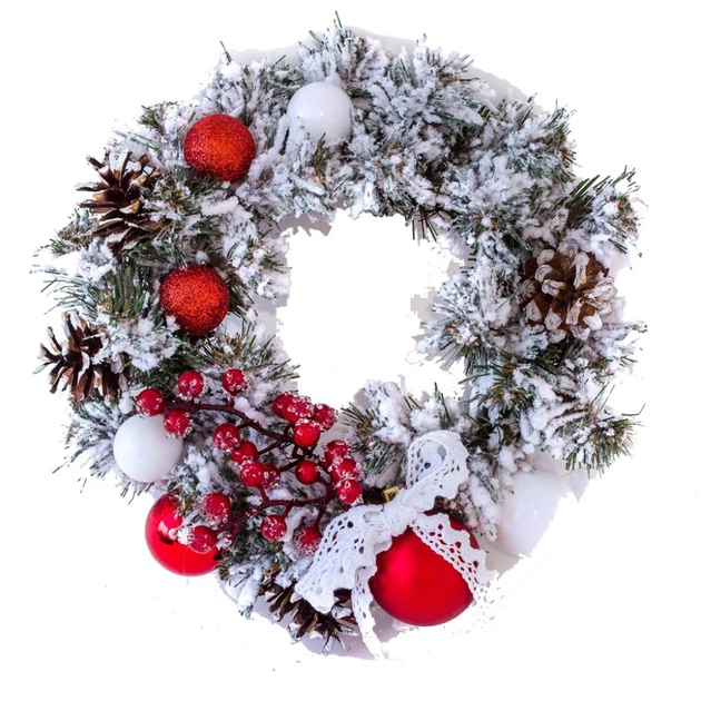 Оригінальний вінок з аксесуарами стане прекрасним декором для вхідних дверей будинку і офісу у період новорічних свят. Різдвяний вінок можна прикрашати зимовими ягодами, гілочками, пуансетією, ялинковими кулями і іншим декором. Всі матеріали екологічно чисті, мають протипожежні властивості. Висока якість матеріалу дозволяє виробу бути не тільки оригінальним і красивим, а ще й довговічним. Матеріал: ПВХ плівка зеленого кольору, дріт. Ширина хвої — 6 см. Діаметр: 15 см.