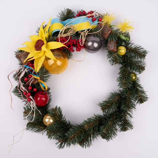 Вінок зі штучної хвої YES! Fun «Щира Україна» діаметром 30 см. прикрашений яскравими кулями та декоративними гілочками.