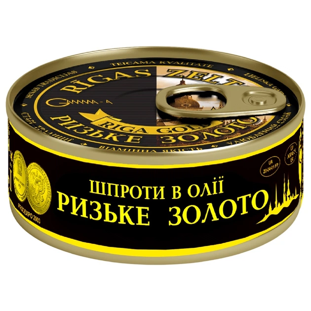 Шпроти в оливковій олії «Ризьке Золото» – це відбірна балтійська кілька виготовлена за внутрішнім Золотим Стандартом Якості, який передбачає традиційну технологію приготування шпрот – натуральне копчення на вільховій стружці. Для оливкової серії підприємство використовує ексклюзивну оливкову олію сорту першого віджиму – Extra Virgin, яку постачає з Греції. Перед копченням риба дефростується, сортується по розміру на спеціальні прути рамки спеціальної вагонетки. Риба з вагонеткою проходить копчення у автоматичній коптильній камері. Комп’ютерне управління контролює рівень копчення та димності шпротів, що дозволяє досягти ідеального копченого смаку. Копчення шпрот «Ризьке Золото» проходить класичним способом у диму з натуральної щепи вільхи. Для виготовлення щепи підбирається якісна деревина вільхи. Після копчення шпроти у стерильних умовах дбайливо викладаються косичкою турботливими руками. Наповнені рибою банки заливаються оливковою олією, додається сіль. Закриті баночки проходять процес стерилізації в автоклаві. Консерви етикетуються та маркуються охолодженими. Шпроти в оливковій олії «Ризьке Золото» мають золотистий колірта унікальний смак натуральної прокопченої риби та томлених запашних оливок.Щоб споживач міг оцінити всю красу традиційних класичних шпротів, в скляну банку відбирають рибку не більше 8 см за розміром.