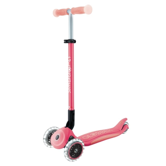 Elite Lights Glow також оснащений запатентованою системою блокування та складання керма Globber, міцною протиковзкою декою, Т-подібним кермом з регульованою висотою в 4-х положеннях зі світлодіодними ручками та світлодіодними колесами без батарейок — як спереду, так і ззаду — які блимають білим кольором для ще яскравіших поїздок!