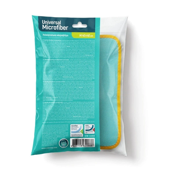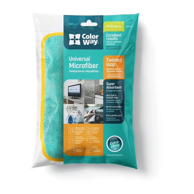 Мікрофібра ColorWay для універсального застосування - це м'яка і щільна мікрофібра, розроблена для універсального використання. Мікрофібру можна застосовувати як для сухого так і для вологого прибирання. Завдяки м'якому тонкому ворсу і спеціальному плетінню "кручена петля" має екстра абсорбуючі властивості - вбирає до 600% води від власної ваги без залишків розводів і ворсу, що дає змогу використовувати рушник для прибирання різних поверхонь, а також для протирання скляних і делікатних поверхонь, таких як (вікна, душові кабіни, дзеркала, хромовані вироби та інше), що робить прибирання максимально ефективним.