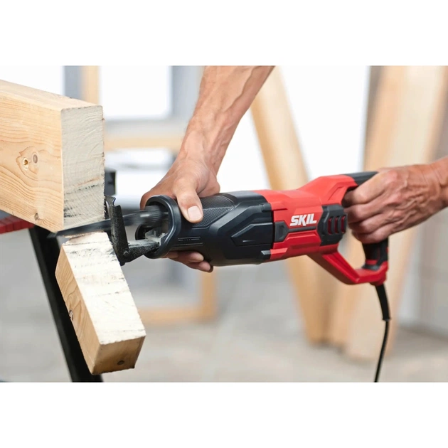 Шабельна пила SKIL 4961 має ефективний двигун потужністю 900 Вт і змінну швидкість, що забезпечує найкращі результати при обробці різних матеріалів. Це робить його ідеальним інструментом для різноманітних завдань пиляння, таких як руйнування, обрізка та обрізка дерев. Зміна лез ще ніколи не була такою простою завдяки системі «Clic», яка не потребує спеціальних інструментів чи ключів. Для вашої зручності цей інструмент має систему балансування противаги під назвою «VRS». Це знижує рівень вібрації, що призводить до меншої втоми під час роботи. Міцний металевий корпус редуктора збільшує довговічність інструменту. Крім того, регульоване положення ніжки дозволяє використовувати лезо більш ефективно. І останнє, але не менш важливе: м’яка ручка на інструменті забезпечує додатковий комфорт при роботі. SKIL 4961 AA оснащений пилковим диском для деревини.