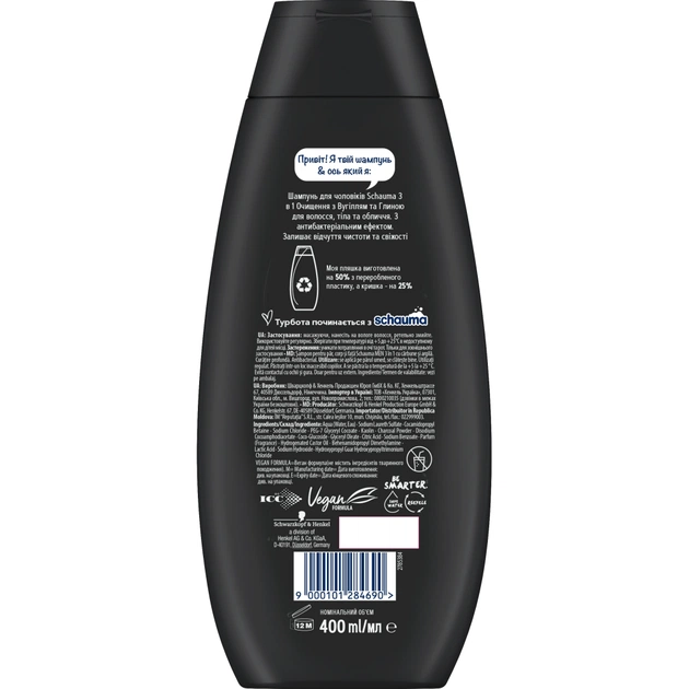 Шампунь Schauma Men 3 в 1 Очищення з вугіллям та глиною 400 мл (9000101284690)