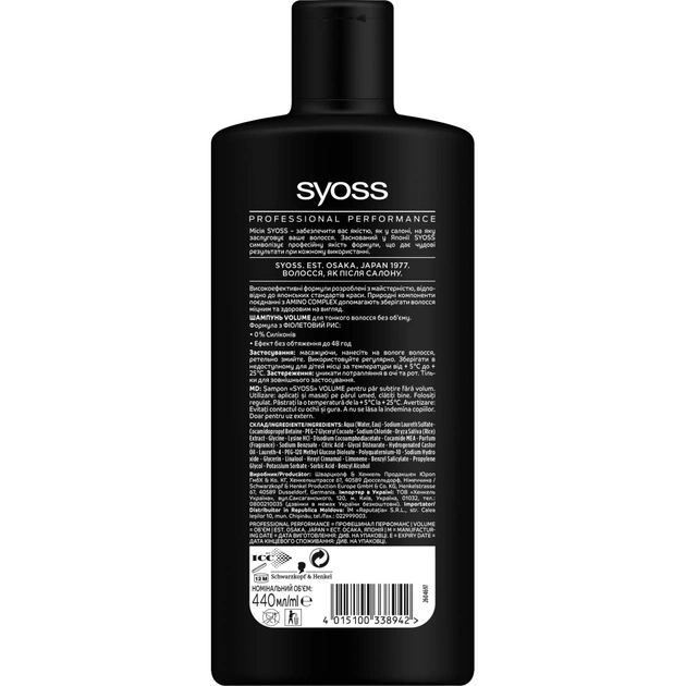 Шампунь Syoss Volume з Фіолетовим Рисом для тонкого волосся без об'єму 440 мл (4015100338942/9000101277296)