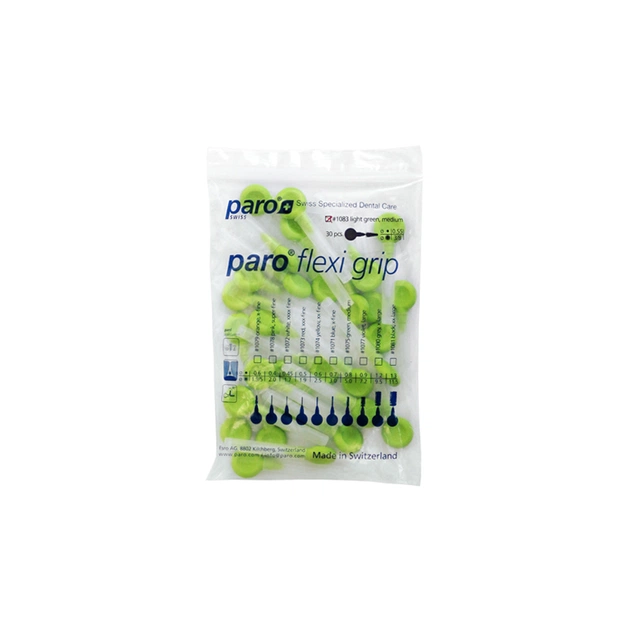 Міжзубні щітки paro Flexi grip готові до застосування. М'яка, кругла, зручна гумова ручка дає змогу тримати її двома пальцями та спрощує уведення йоржика в міжзубні проміжки. Гнучка ручка приємна на дотик. paro Flexi grip з захисним ковпачком ідеальні для використання вдома та в дорозі. paro Flexi grip також дуже популярні для очищення брекет-систем. Усі paro Flexi grip міжзубні щітки мають захисне пластикове покриття стрижня. paro Flexi grip, середні, салатові, конічні, Ø щітки 3.0/8.0 мм, Ø стрижня 0.55 мм, Ø оброблюваного отвору 1.2 мм