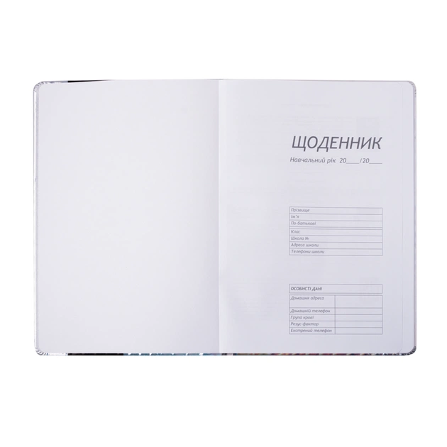 Декоративне оформлення форзаців за мотивами обкладинкиЗакладка-лясе для зручного та швидкого перегортання сторінок підібрана під дизайн обкладинки та підкреслює загальне сприйняття щоденникаВнутрішній блок - білий офсетний папір щільністю 70 г/м² з розлініюванням сірим стриманим і приємним для ока кольоромВміст блоку: сторінка для персональних даних, символіка України, інформація про вчителів та однокласників, розклад занять (основних та факультативних) та дзвінків на семестри, розклад на тиждень (6 днів по 8 уроків), довідкова інформація з математики, фізики, хімії, табель успішності