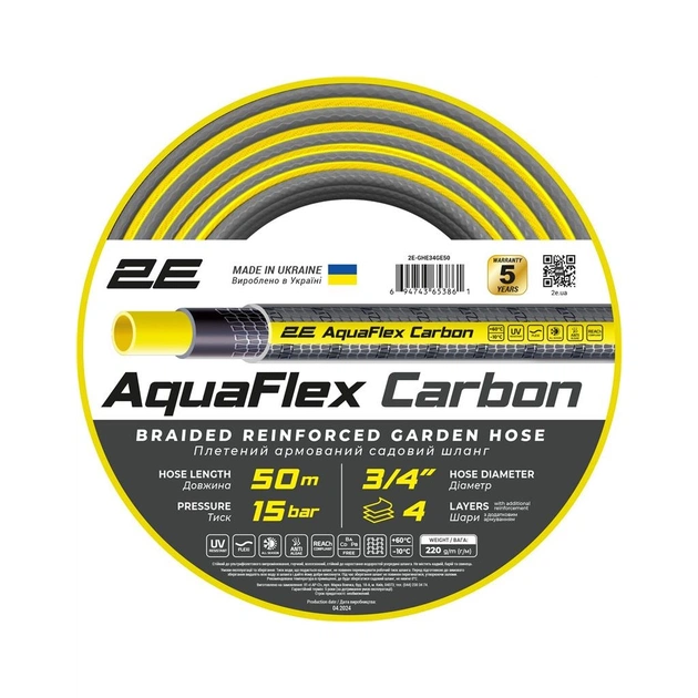 Клумби, сад, город і газон завжди будуть зеленими та здоровими, якщо з-поміж обладнання є шланг серії AquaFlex Carbon. Шланг виготовлено з якісних ПВХ-матеріалів, які не місять кадмію, барію та свинцю, зумовлюючи безпеку як для здоров’я, так і для довкілля. Характеризується опором на розрив до 20 бар. Завдяки поширеному діаметру шланга 3/4" його легко під’єднувати до системи водопостачання, зумовлюючи ефективне виконання поливальних робіт.