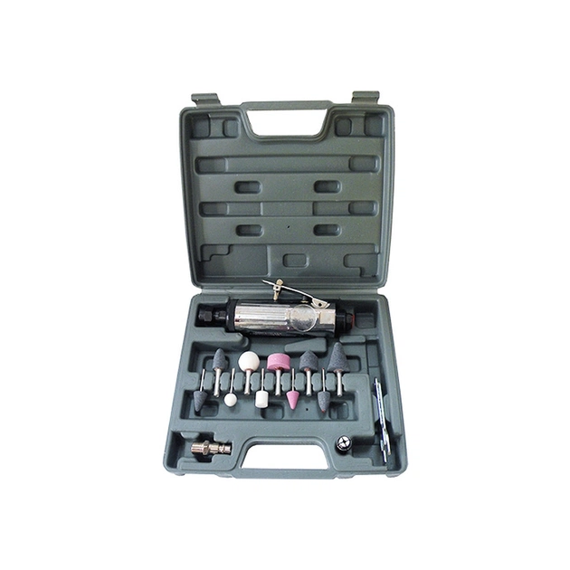 Цей інструмент працює від повітряного джерела живлення, що робить його економічним і екологічним вибором. Комплектація включає саму шліфувальну машину, комплект шліфувального каміння, документацію, насадки та зручний кейс для зберігання і транспортування, що забезпечує додатковий комфорт для користувача.