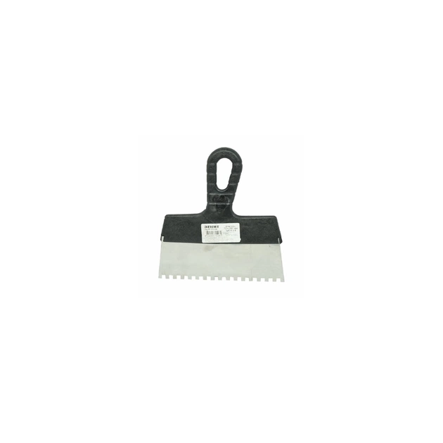 Шпатель складається з двох комплектуючих – леза і ручки. Лезо шириною 200 мм виготовлено з високоякісної сталі, що забезпечує надійність і тривалий термін служби робочого полотна. По всій довжині зовнішньої кромки розташовується ряд зубців розміром 6х6 мм, які дозволяють більш економно та ефективно використовувати клейові суміші. Пластмасова ручка має оптимальну форму для комфортної роботи інструментом.