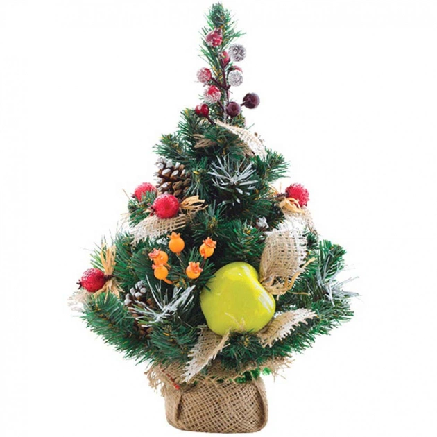 Штучна маленька ялина з яскравими ягідними аксесуарами — відмінний декор для приміщення у період новорічних свят, який можна використовувати, прикрашаючи безліч поверхонь у будинку, офісі, в торгових центрах. Поставте таку ялину на столі, полиці, тумбочці, на прилавку магазина, в прикасовій зоні – і святковий настрій оточуючим буде гарантовано. Компактність і якісне виконання даної прикраси — це і є її головні переваги. Матеріал: ПВХ плівка шириною 6 см; дріт; дерев'яний пеньок, обтягнутий мішковиною. Висота: 45 см. Діаметр нижнього ряду: 32 см. Габарити: 0,45 м.