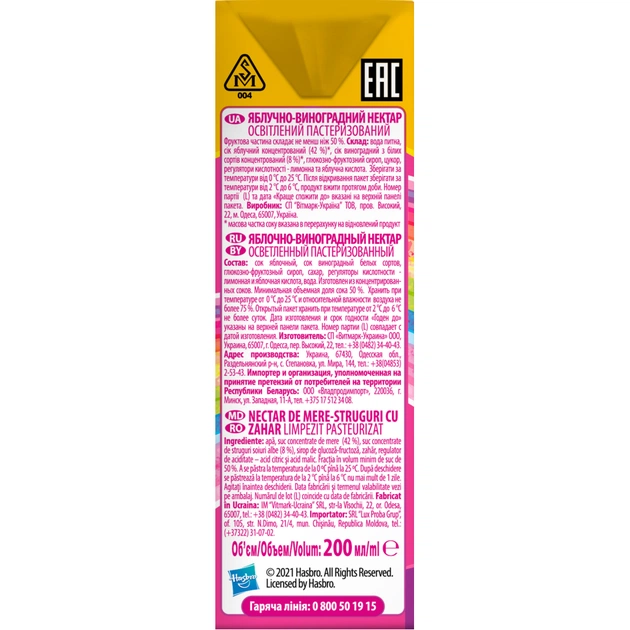 Сік дитячий Джусік Поні-Трансформери Яблучно-виноградний 200 мл (4820192262958)