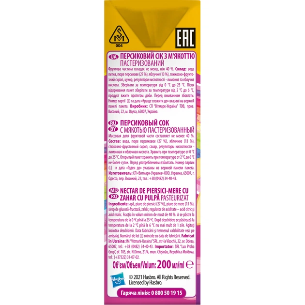 Сік дитячий Джусік Поні-Трансформери Персиковий з м'якоттю 200 мл (4820016252677)