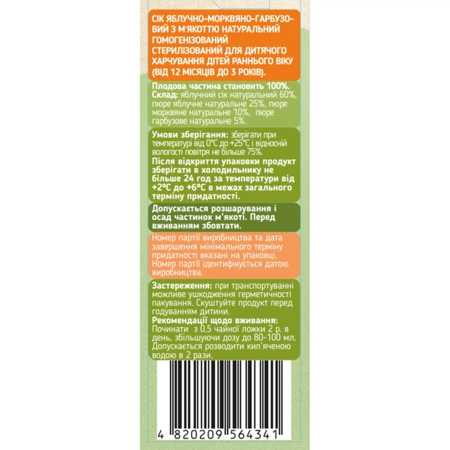 Сік дитячий Galicia Baby яблучно-морквяно-гарбузовий з м’якоттю натуральний 200 мл (4820209564341)
