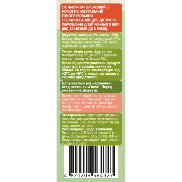 Сік дитячий Galicia Baby яблучно-персиковий з м’якоттю натуральний 200 мл (4820209564327)