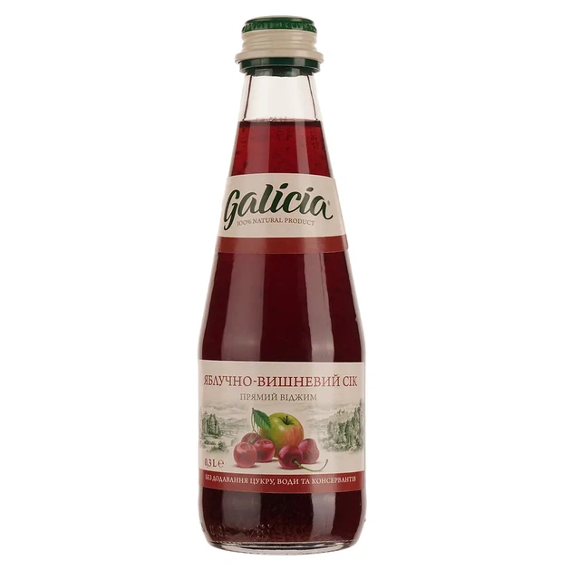 Сік Galicia яблучно-вишневий - солодкі яблука у поєднанні з приємною кислинкою вишень утворюють оригінальний смак, що освіжає. Цей сік - справжній еліксир молодості, адже властивості яблука, що очищають, посилюються антиоксидантною дією вишні та запобігають передчасному старінню.