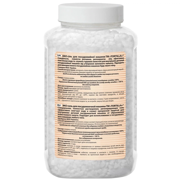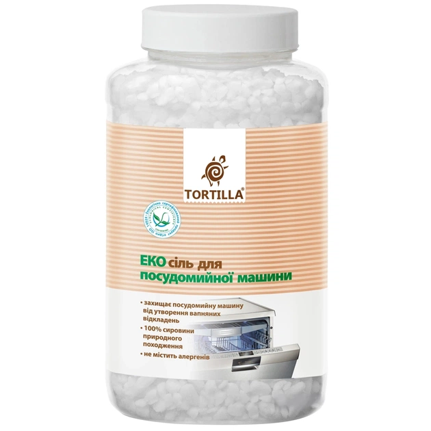 Еко сіль для посудомийної машини «Tortilla» — це спеціальна, повністю розчинна регенерувальна сіль, яка ефективно пом’якшує воду та захищає внутрішні деталі посудомийної машини від утворення вапняного нальоту.