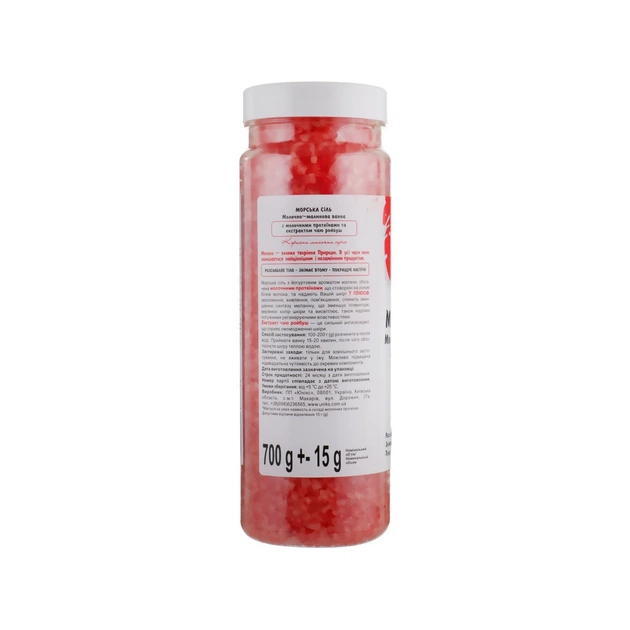 Ванна з морською сіллю, теплим ароматом малини та молока — ідеальний спосіб позбавитися втоми, повернути відчуття спокою й внутрішньої гармонії, а також подбати про красу та здоров’я шкіри тіла. Формула засобу багата мінералами, вітамінами, протеїнами молока, екстрактами чаю ройбуш і ягід малини — прекрасна основа для б’юті-релаксу з ефектом SPA. Насолоджуйтеся приємним купанням, дією теплої води й ефектом, який подарує б’юті-процедура — м’якістю та гладкістю шовковистої й пружної шкіри.