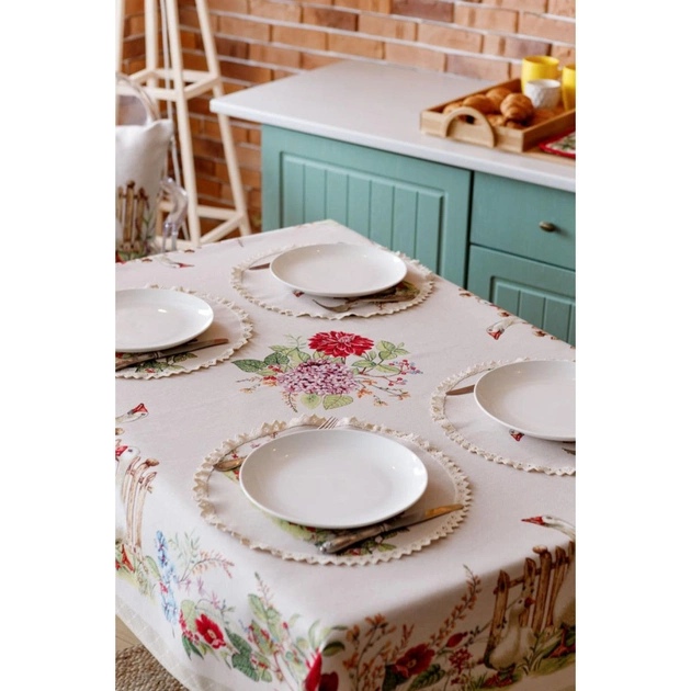 Скатертина на стіл із високоякісної іспанської тканини. Це стильний подарунок сім'ї, друзям, родичам та колегам на честь будь якого свята. Також це прекрасне доповнення до серветок, доріжок, наволочок та подушок з гобеленової колекції Гуси.